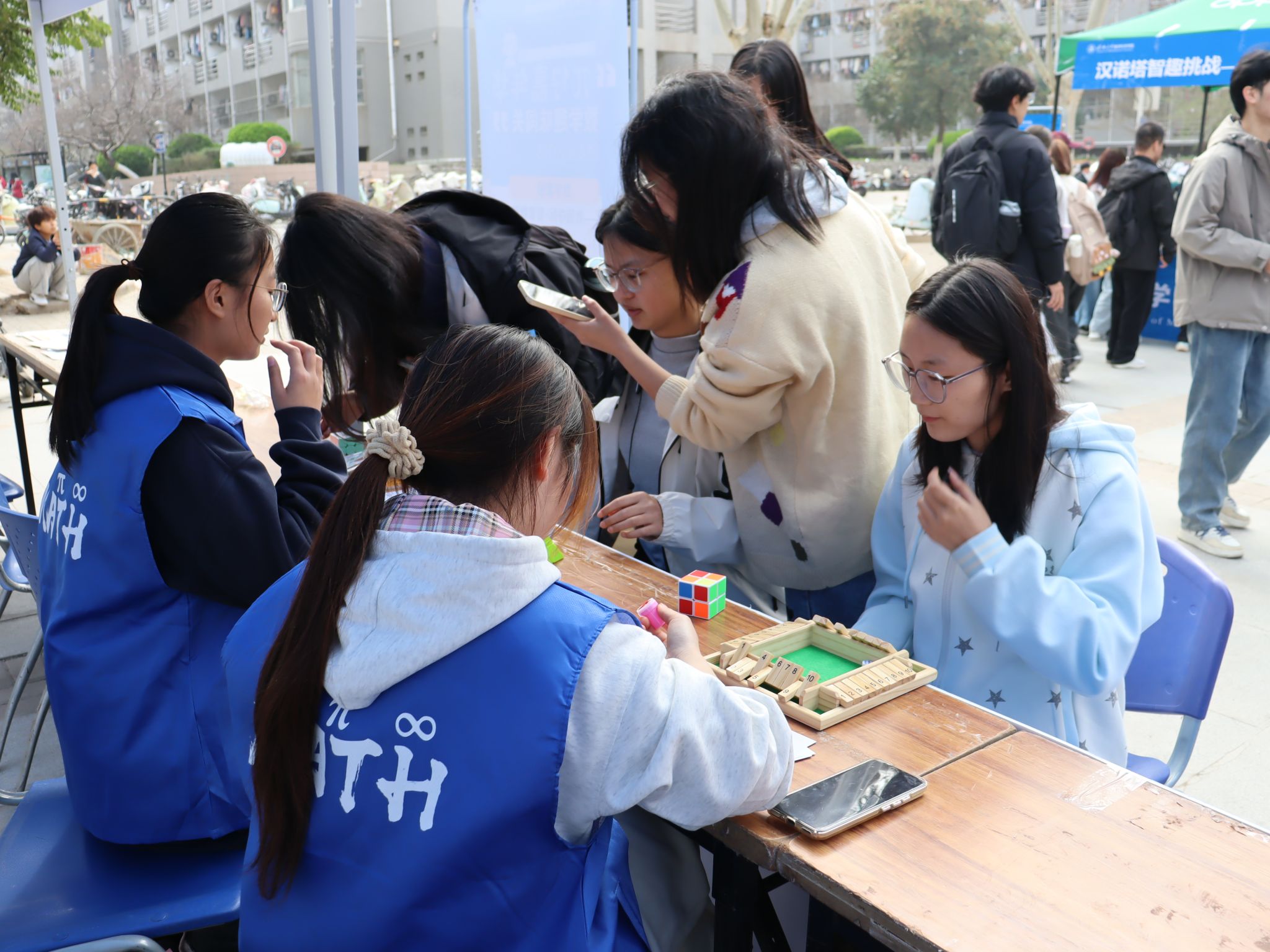 启动仪式前后,师生共同参观数学科普文化展览并体验“π仔嘉年华”趣味游园会,在轻松愉悦的氛围中感受数学的魅力与乐趣。游园会项目覆盖基础运算、逻辑推理、空间思维、跨学科融合等维度,各关卡兼顾挑战性与体验感。数独大作战考验逻辑推理与全局统筹能力,数字飞花令实现数学与古典诗词的跨界融合,扑克牌算数王比拼速算技巧与策略思维,数字华容道锻炼空间推理与路径规划能力……活动现场人气高涨,不时传来阵阵喝彩。