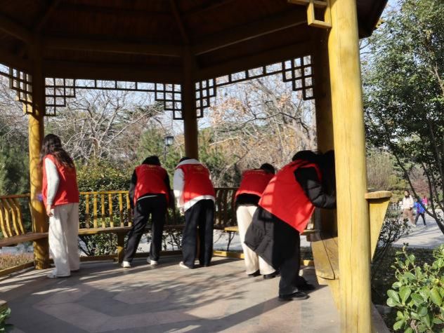 在聆听了英雄事迹后,全体师生面向革命烈士纪念塔肃立默哀,表达对革命先烈的沉痛悼念和无限敬仰。默哀仪式庄重肃穆,空气中弥漫着对英魂的深切追思。在一分钟的默哀中追思英烈,静静感受那段烽火岁月里的热血与奉献。默哀结束后,大家有序行动,团员们身着红色志愿马甲,手持清洁工具分组行动,开展景区环境维护志愿服务。大家手持抹布擦拭护栏和公共座椅、清理周边杂物,分工协作维护陵园整洁,用双手守护红色圣地的整洁美观,在实践中强化了团员的历史使命感与责任感。