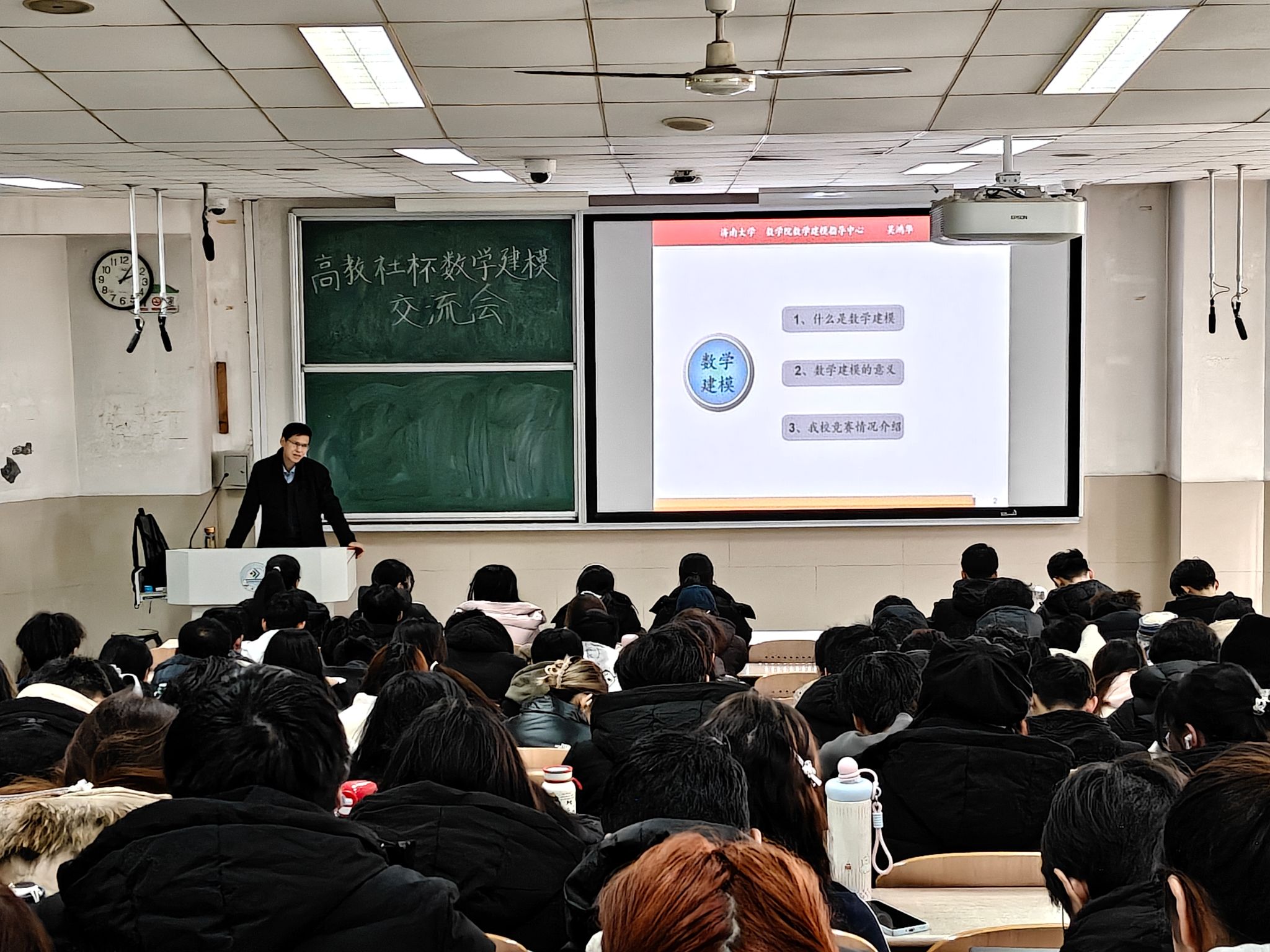 吴鸿华以2011年至2018年间的多个国家级赛题案例为切入点,通过拆解问题背景、建模逻辑与求解思路,向同学们生动诠释数学建模的核心内涵——通过抽象与数学化将实际问题转化为可求解的数学模型,并利用其结果解释或指导现实的一个系统过程。 陈天雨作为省一等奖团队队长,系统分享数学建模竞赛的实战经验,涵盖团队组建、角色分工、问题拆解、模型选择及论文撰写等关键技巧,并强调时间管理与团队协作。分享会内容充实,有效解答备赛困惑,增强参赛信心。